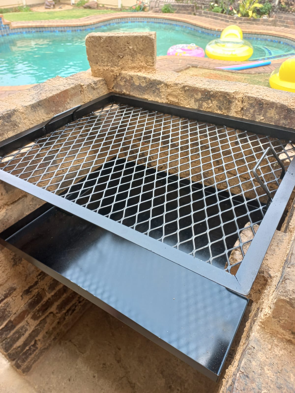 Basic mild steel braai grid and ashpan. Slides for grid optional extra. Sizes 700mm length x 500mm depth R1600 for both. Price for larger sizes also available on request.