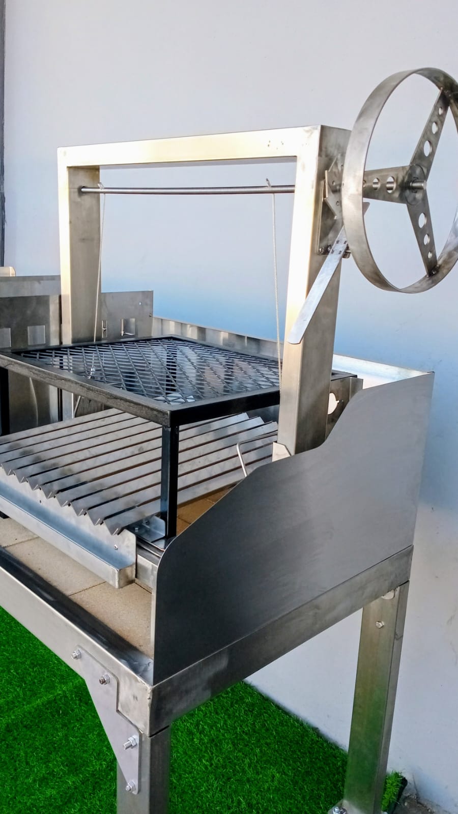 ARGENTINE 304 STAINLESS STEEL TABLE BRAAI WITH ELECTRIC ROTISSERIE AND WARMER GRID Plus high heat bricks on a table