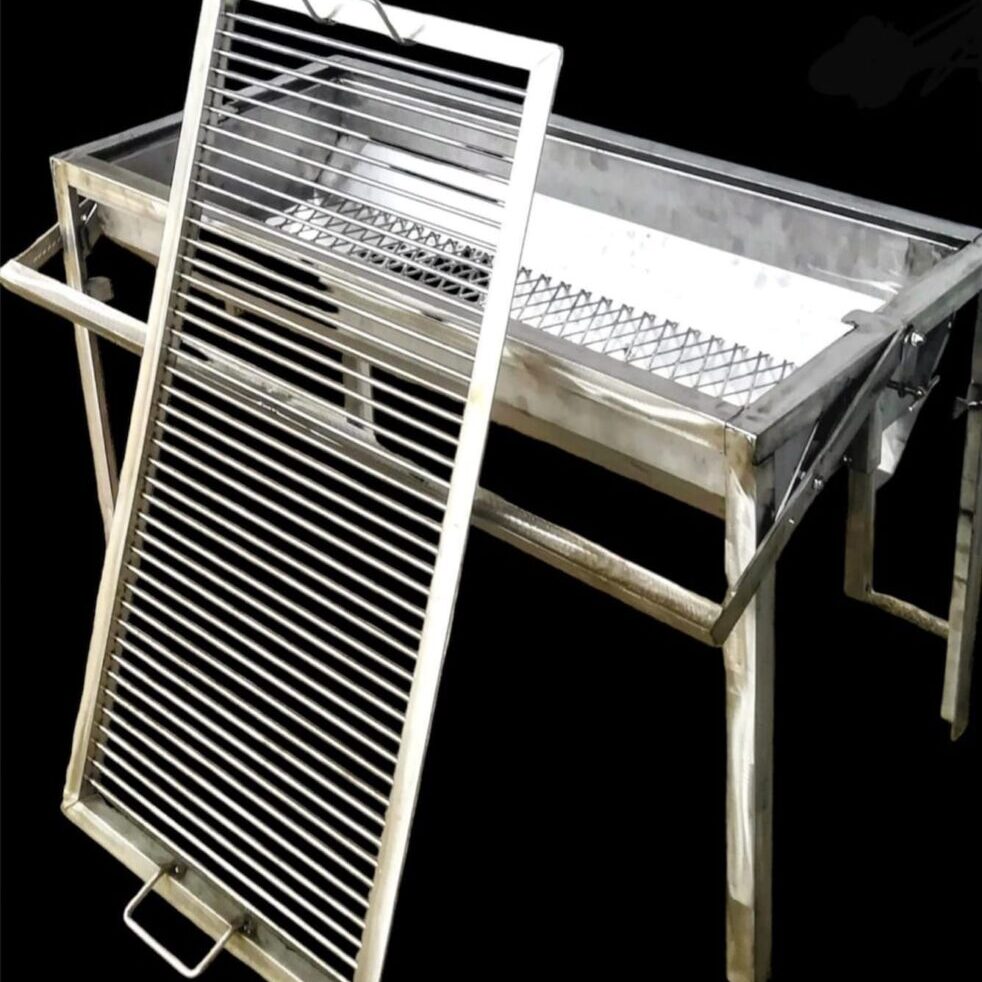 Stainless 304-grade sizes 1m length x 550 mm wide x 850mm height. Has adjustable grid and heavy duty in 6mm round bar. Everything is stainless steel. Wheels can be added at no cost.
